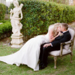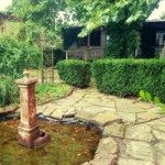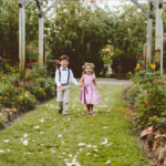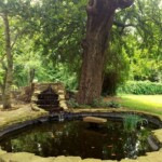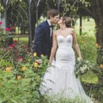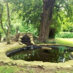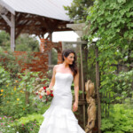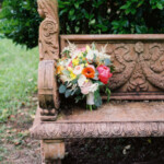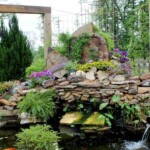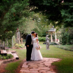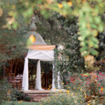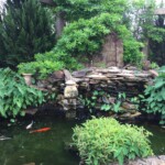 Abundant with elephant ears, deep purple flowers, mixed greenery and natural stonework this ceremony site features a Koi Pond with waterfall, beautiful lighting, lily pads and mature trees